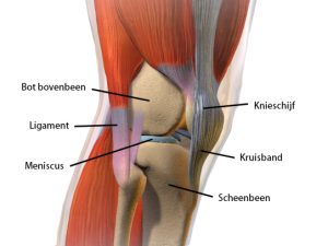 De knie wordt gevormd door 3 beenderen : het dijbeen (femur), het scheenbeen (tibia) en knieschijf (patella).