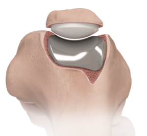 De trochlea (goot in het dijbeen) wordt vervangen door een metalen component en een kunststof (poly-ethyleen) component wordt geplaatst op de knieschijf. Beide componenten worden met botcement vastgemaakt aan het bot.