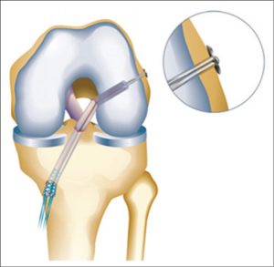 De nieuwe pees wordt opgehangen in de tunnel van het dijbeen. Klassiek wordt een endobutton systeem gebruikt.