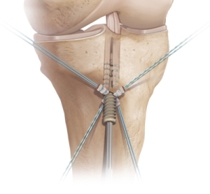 Het geheel wordt via de boortunnels in de knie gebracht.