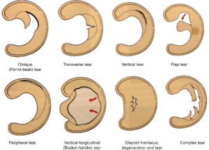 Het type accident en de kwaliteit van het meniscus weefsel bepalen welk type scheurletsel ontstaat.
