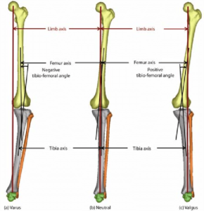 Bij een normale “rechte” knie loopt de belasting van de knie door het midden van de knie. Indien er as afwijkingen aanwezig zijn, loopt de as van belasting te veel naar binnen (O-been) of te veel naar buiten (X-been).