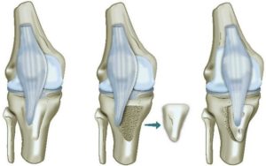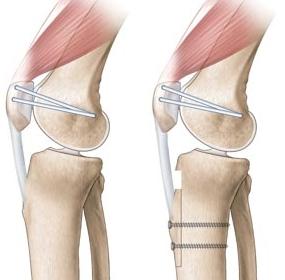 Ter hoogte van de aanhechting van de patellapees op het onderbeen (tuberositas), wordt de pees met een botblokje losgemaakt. Dit botblokje met de patellapees erop vast, wordt verplaatst en op de optimale plaats terug vastgezet door middel van 2 schroeven.