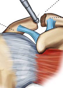 Via kijkoperatie wordt een volledige inspectie gedaan van het schouder gewricht om andere oorzaken van schouderpijn uit te sluiten. Steeds wordt de subacromiale ruimte groter gemaakt (=subacromiale decompressie) en worden alle papegaaienbekken verwijderd. Nadien wordt een stukje van het aangetaste, kapotte kraakbeen uiteinde van het sleutelbeen verwijderd. De ruimte die ontstaat aan het uiteinde van het sleutelbeen vult zich spontaan op met littekenweefsel.