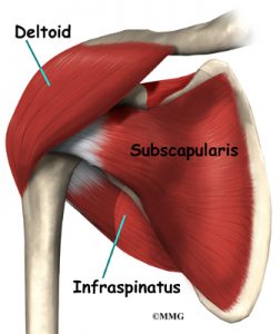 De belangrijkste spiergroep of de motor van de schouder is de rotator cuff. De rotator cuff bestaat uit 4 spieren (Supraspinatus, infraspinatus, subscapularis en teres minor). De pezen van de rotator cuff spieren zitten vast aan de bovenarm rondom de humeruskop. De rotator cuff spieren zorgen ervoor dat we onze arm voorwaarts en zijwaarts kunnen heffen, maar tevens dat we onze bovenarm kunnen draaien (exorotatie en endorotatie). Dit zijn zeer belangrijke handelingen in dagelijks leven (bv. Rug wassen, haar kammen, eten, …) Daarnaast zijn de rotator cuff spieren ook cruciaal in de stabiliteit van het schoudergewricht door de bol in de pan te houden.