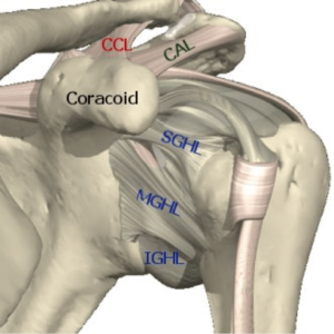 Om de stabiliteit van de schouder in normale omstandigheden te garanderen beschikken we over een stevig vlies rond de schouder (kapsel) met daarin sterke verstevigingsbanden (gewrichtsbanden). Bijkomend is er een stevige opstaande, kraakbenige ring rond de kom, waar het kapsel zich op vasthecht. Tevens zorgen de rotator cuff spieren (actieve link naar anatomie) voor een bijkomende dynamische stabiliteit, waarbij de rotator cuff de bol gecentreerd houdt in de kom.