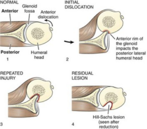 Bijkomend ontstaat er een indeuking in de bol (humeruskop) van de schouder omdat deze tijdens de ontwrichting tegen de rand van de kom (glenoid) wordt geduwd (hill sachs letsel). Bij oudere mensen kan een ontwrichting ook gepaard gaan met een scheur in de rotator cuff.